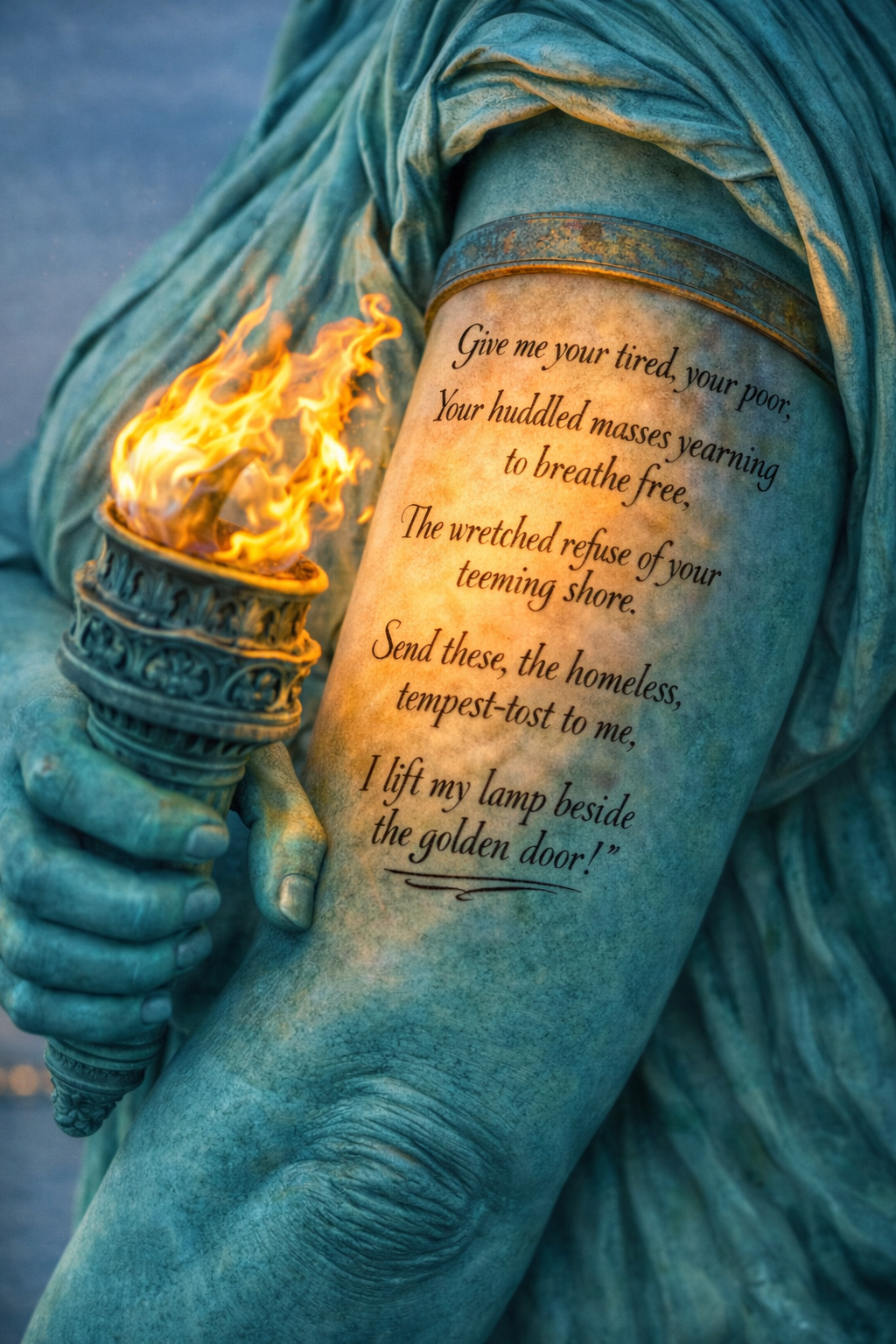 The modern Lady Liberty has something to say about Immigration and in a modern way, she has even had her welcoming statement tattooed on her arm. She will even hold her torch near so that you can see how she feels. And, I’m not really sure she cares that they are illegal or legal. And because her duties of welcoming the “poor and huddled masses” has been severely reduced in our current Administration, and because of the recent economic upheavals, she has found the need for a second job. She performs ground control at Joint Base Andrews, and quite often directs Air Force One to it’s proper position on the tarmac. And yes, she has been given permission to use her torch in both of her jobs.