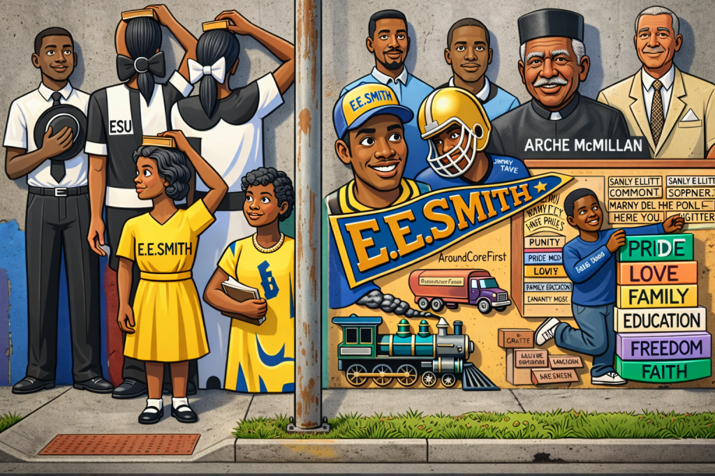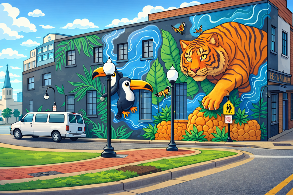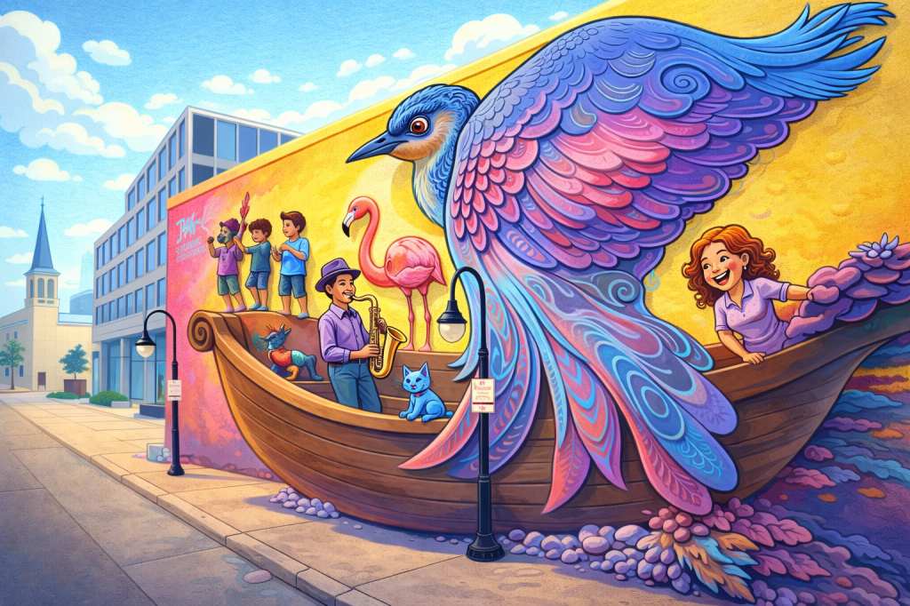 First you see the coloring & cartooning effect from the original pen & ink, black & white drawing. The character springs to life, with a yellow coat and purple polka dot dress. Next I “make her 3D” and her body rounds out. I then have the AI have her walking toward a park bench (all from my imagination) and it shows us her back side, which to me makes her behind look enormous. *If the woman asked, “does this dress make my behind look big,” I would have to respond, “No, the AI made your behind look big. I didn’t pay attention that her surprised look had followed her to the park bench. And then on to pushing a pram. Only until I put her in a phone booth and added a small dog did I have the AI get rid of her surprised look.