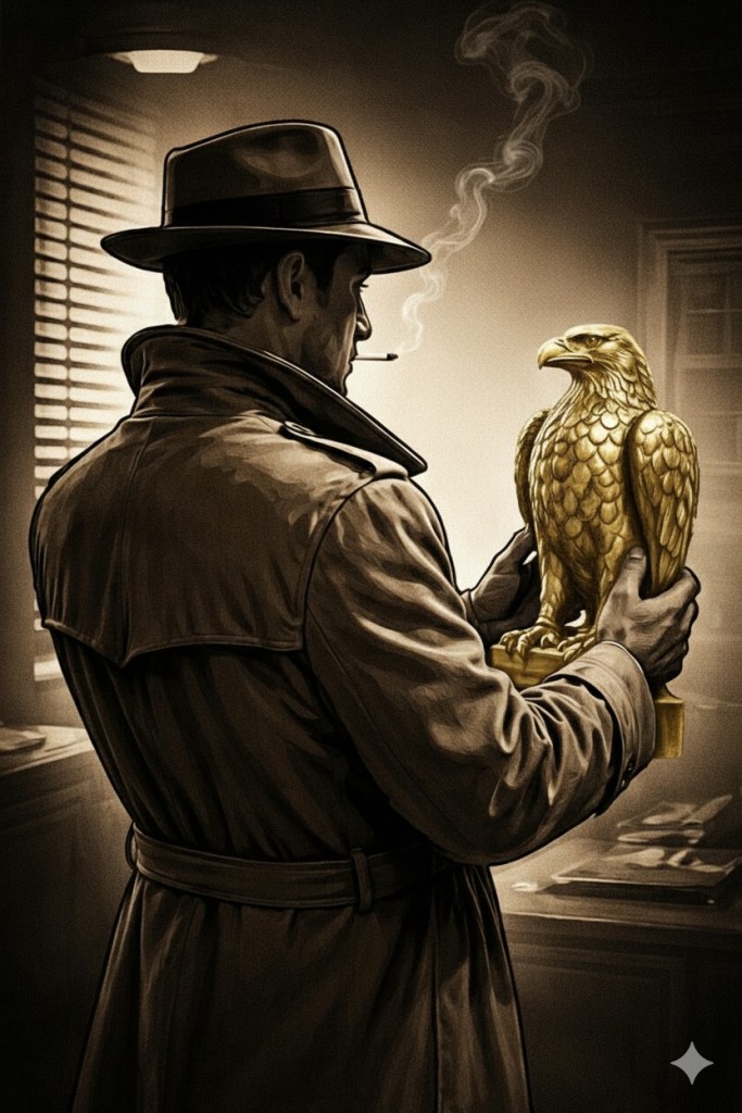 Recently I’ve found doing this can be a great deal of fun. The end result is usually of such depth from the original that it’s like finding a golden Eagle beneath a statue painted with black paint. This, a reference to “the Maltese Falcon,” who instead of an eagle, was indeed supposed to be a statue of a golden falcon that had been passed down through the ages, suffering intrigue, murder and thievery. But now Sam Spade, legendary fictional detective, is holding the bird statue in his hand and realizing its hidden worth. *I also had AI generate a Spade moment, but with a Golden Eagle. I love what the AI did. Classic, smoky, film noir.