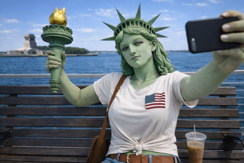 I’m not sure that I like that she smokes, but any gal that carries a torch around has to find other things to do with it, other than just welcoming the weary to our country. I love the idea of her taking a selfie with her posing with her lamp and the pedestal on which she normally stands in the background. Always self aware. What a modern gal.