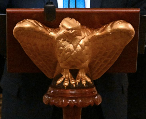 Oh, and why the golden eagle? I was watching a YouTube video of President Trump speaking somewhere, and in front of the podium was an odd golden eagle statue. I say odd, because it was reminiscent of some of the eagles from the 1940s. See below.
