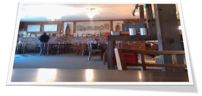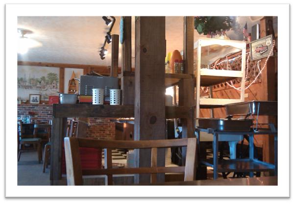 Part of the “country clutter” included paper fans stapled along one of the lintels. They included church fans, Hooters and a Georgia peach. Bathrooms to the right (above) just past the buffet line.