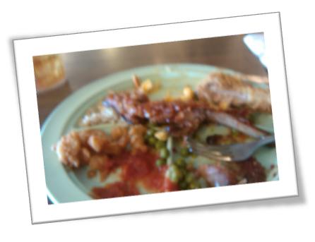 Above: Sorry for the out of focus snapshot. Even in focus it would not have been a pretty sight. The remains of a BBQ rib, fried chicken bones, some shrimp & cocktail sauce and a few bits of macaroni & cheese.