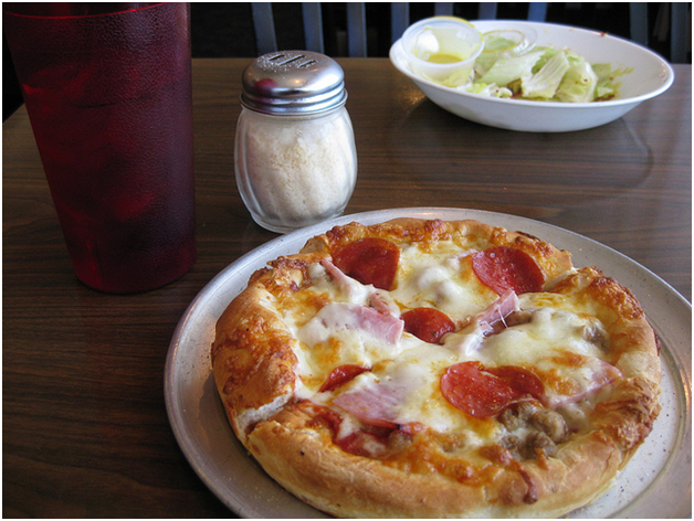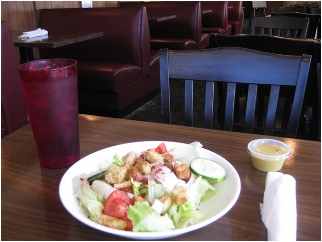 I ordered the Mini Pizza with a House Salad. This came with sweet tea, which was good. The honey mustard dressing was sweet. It reminded me of the honey mustard dressing which used to be served at Tony’s Pizza in Fayetteville (before Tim was killed). The salad had large chunks of ice berg lettuce. The tomatoes had some flavor, although it was too early in the season for local varieties.