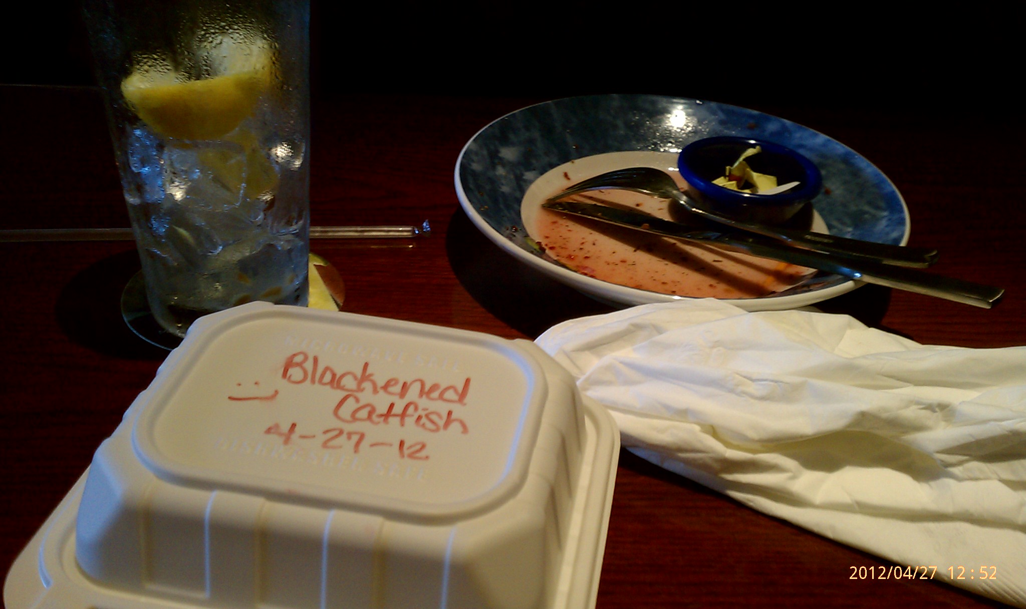 My waitress was Christine and her trainer was Alicia.  I had the blackened catfish with wild rice and a salad with raspberry vinaigrette and water to drink.  I’ve had this once before and enjoyed it.  The price comes to $9.18 plus tip, and I end up with a little rice and a good portion of fish.  *I think I may fix some of the red rice that I bought at Whole Foods last Saturday and a salad for the leftovers.