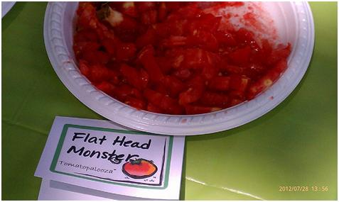 The lines quickly formed as we stepped from plate to plate down each side of the lined up tables. Toothpicks sticking the various tomato samples, and some (self especially) making comments regarding interesting tastes or colors. One of the first red tomatoes that I tasted that I found unusual (in flavor) was the “Flat Head Monster”. This tomato had an “earthy” flavor, somewhat like a mushroom. It was different and good. It was interesting to taste the nuance of flavors as you progressed down the line.