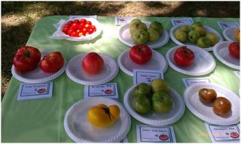 A welcome sign appeared affixed to a fence and I entered, following a few other people. There was a welcome table with a couple of hostesses and a registration sheet. One sheet for presenters (tomato bringers), and one for the others, which I signed. There were strips of paper with two choices to fill in: Best Tasting and Most Unusual tomato (at least that is how I remember the choices).