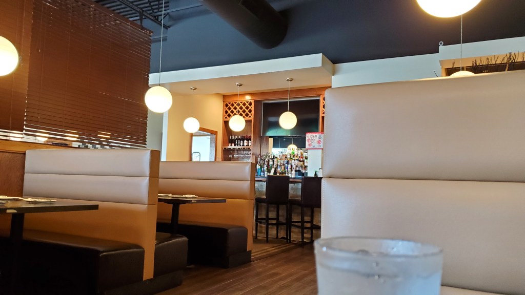 The restaurant is relatively large with a large Hibachi section, a small bar area with TV and a smaller divided boothed area.