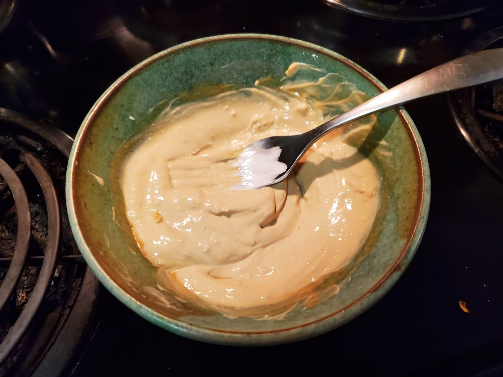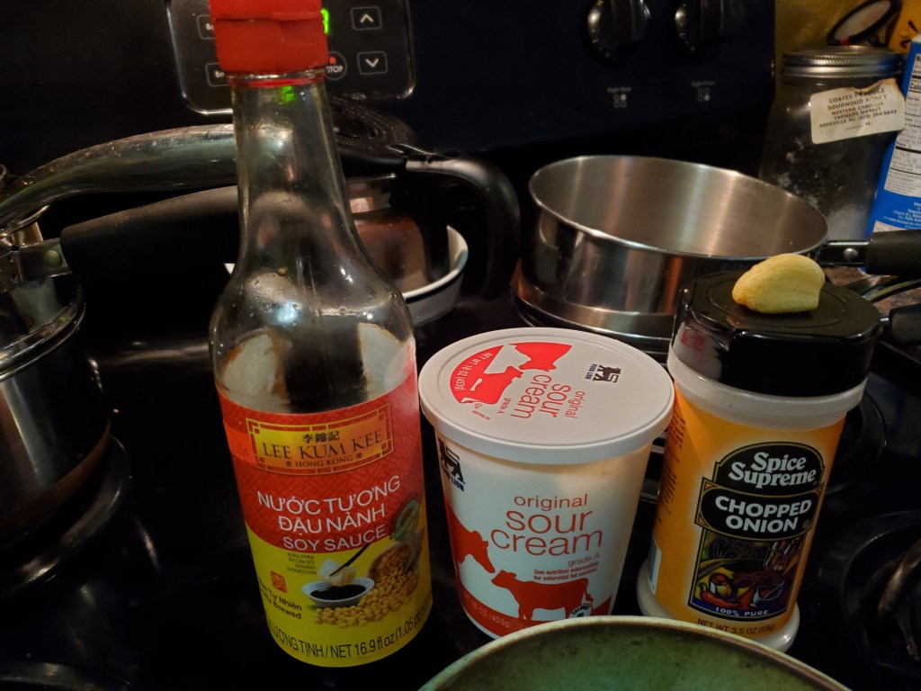 I mixed the two ingredients together, thoroughly, and tasted. Oh, my! It was almost the same flavor as if I had added the onion soup ingredients to sour cream. It then came to me that the onion soup mix probably mimicked the soy sauce flavor. I added some salt, although I could have added more ‘salty’ soy sauce. I also tried some garlic powder, and I had some dried onion flakes.