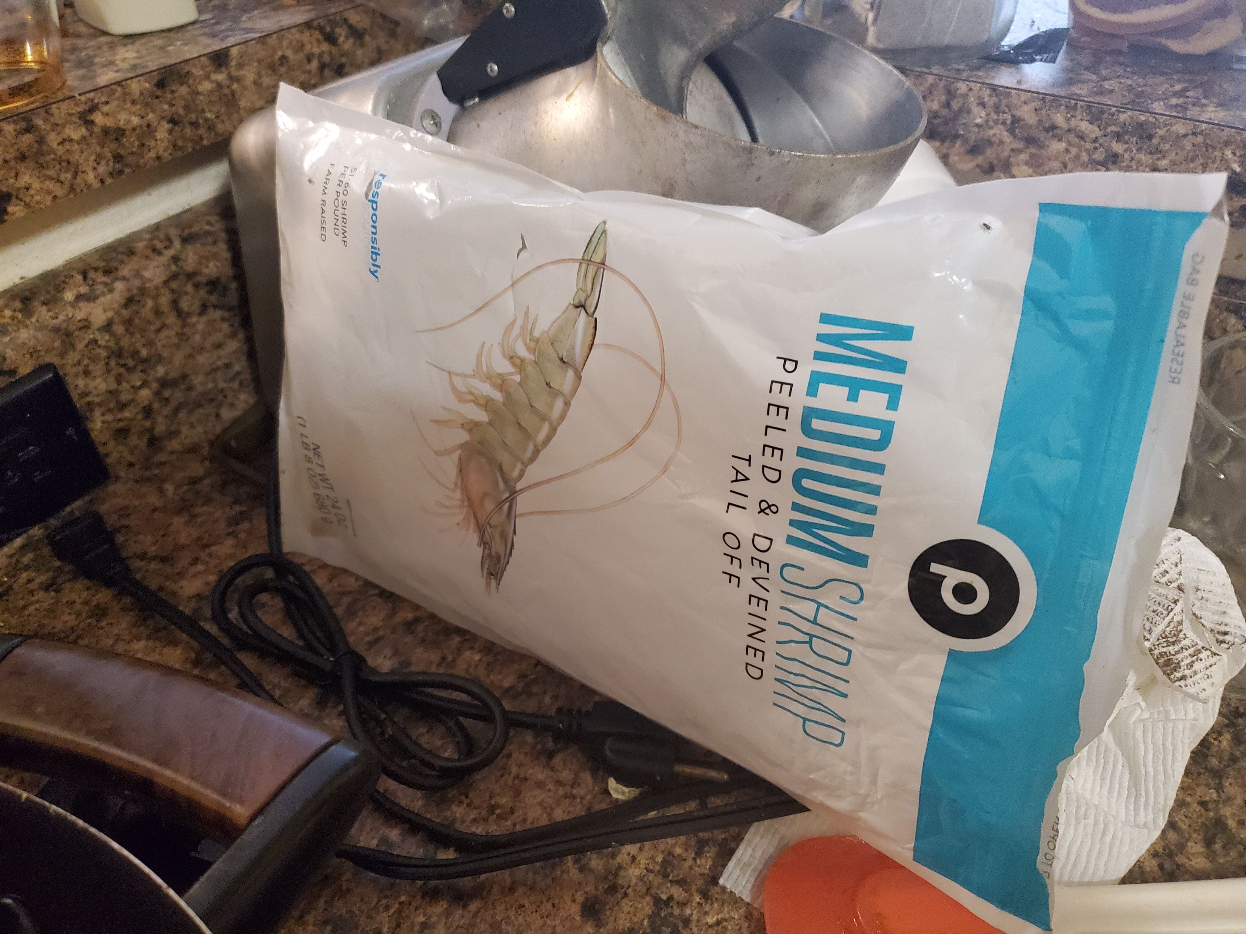 I had put a bag of shrimp in the microwave to thaw. That takes about 15 minutes. This is something I also do for my Kielbasa, Shrimp & Zucchini dish. At the end of the thawing time, the shrimp are already pink and cooked, so I added them to the fried rice.