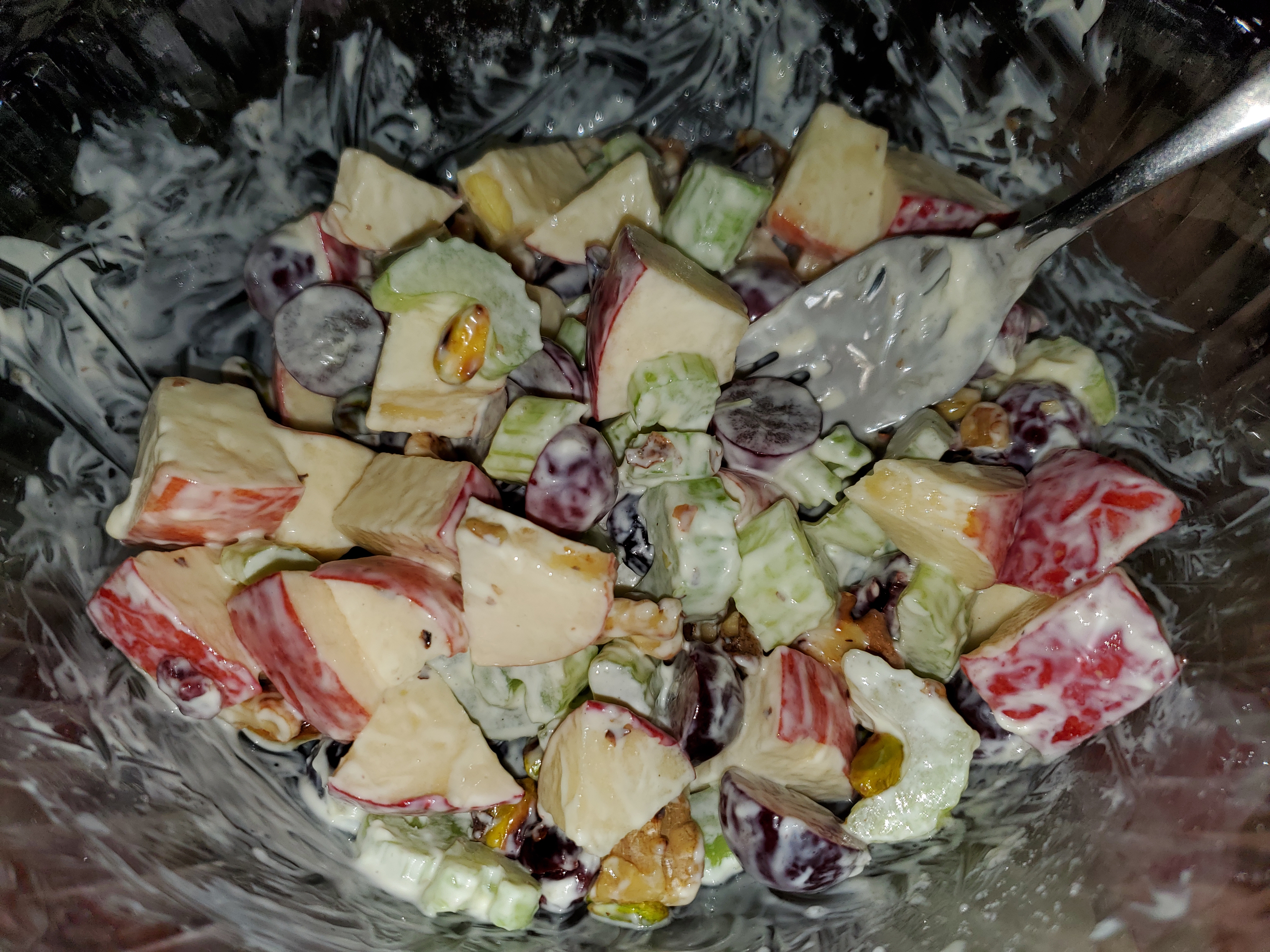 So, now I have made a Waldorf Salad at home about three times and it has turned out very well. I like toasted walnuts and pistachios, some raisins, halved seedless grapes, apple slices (Gala, Envy) , chopped celery, Equal sweetener and mayo. I’ve also added some Greek Yogurt to the mayo, and that does give a light tanginess to the dressing. I added some chopped dates, and that is pleasant also.