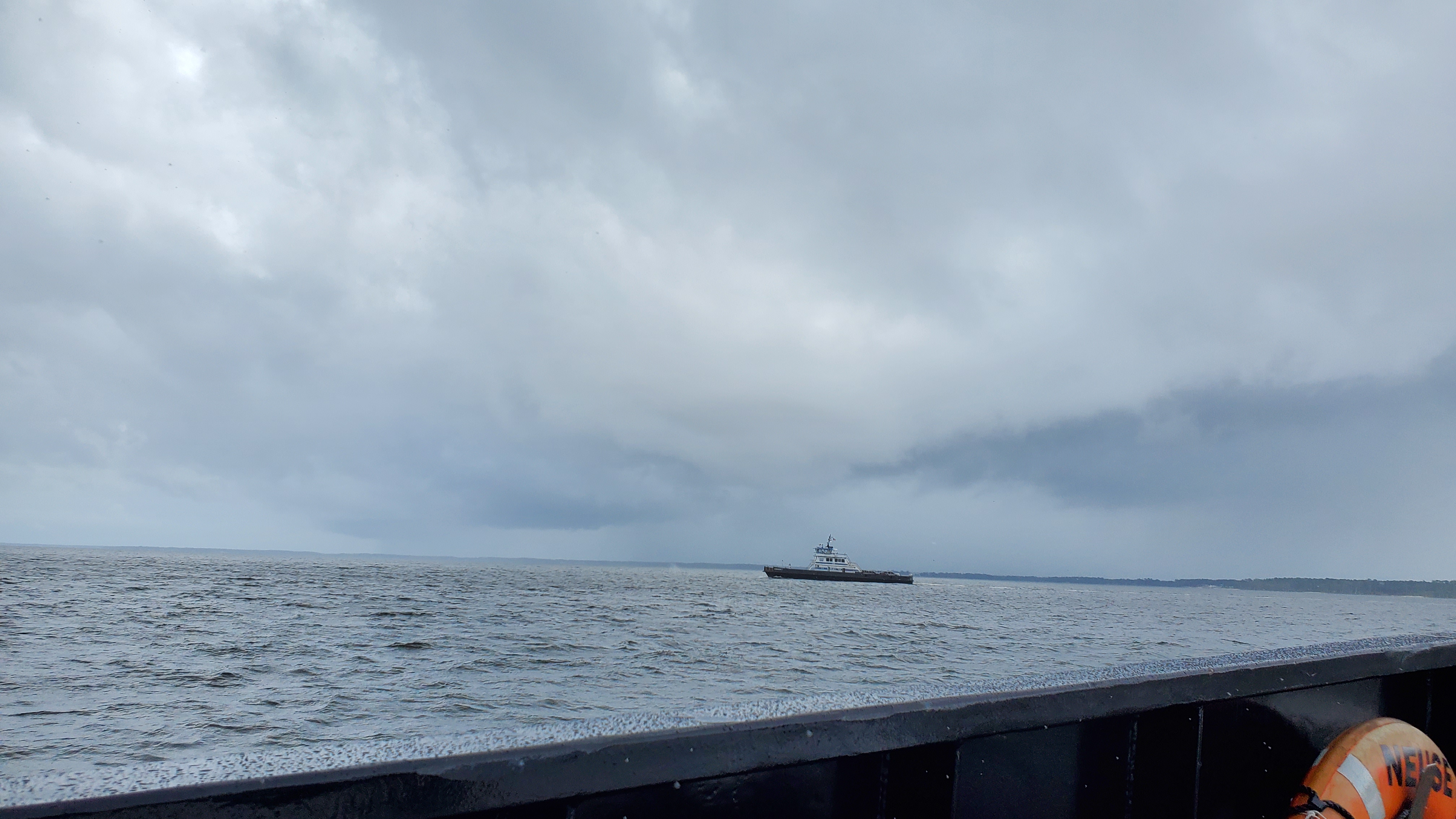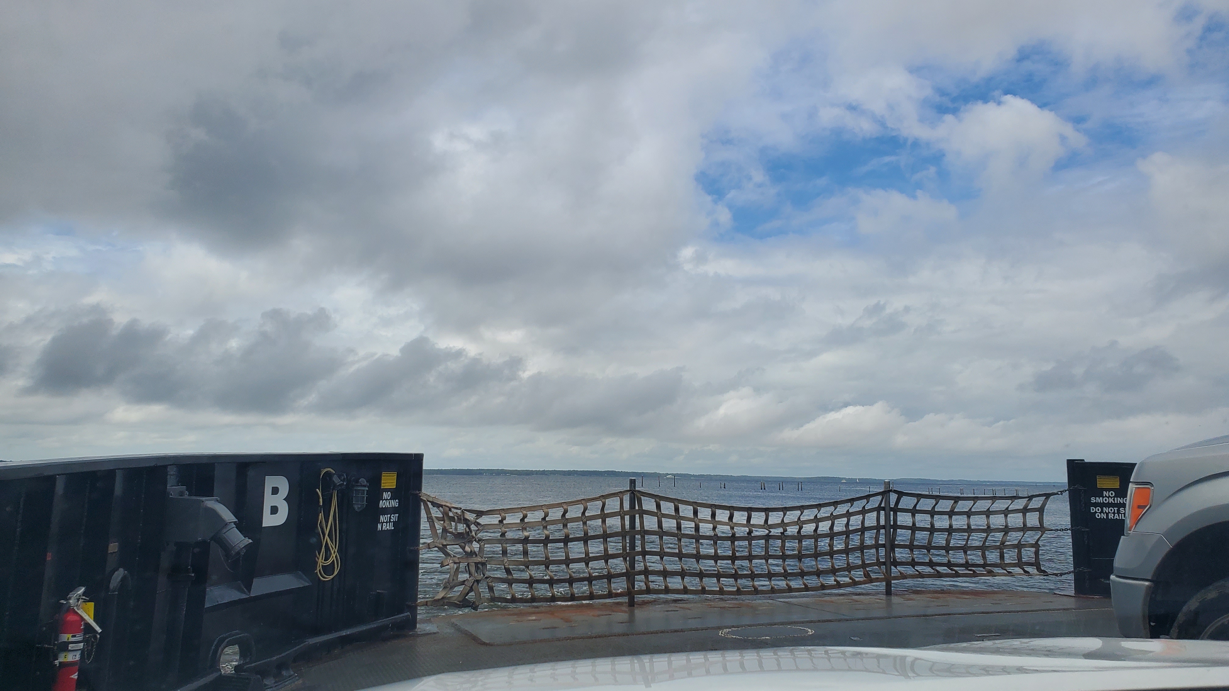 Earlier in the day I took one of my favorite rides, upon the auto ferry running between Minnesott Beach and Cherry Branch. It was a little stormy and I can see some of the rain that has already fallen on the black railing of the ferry.
