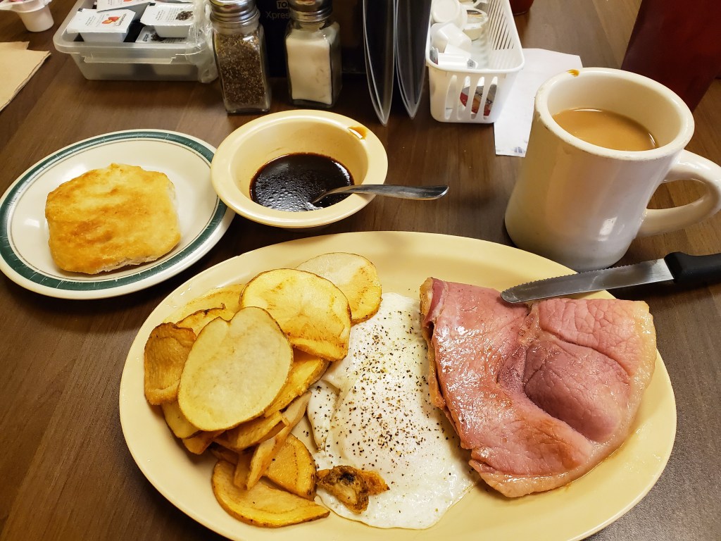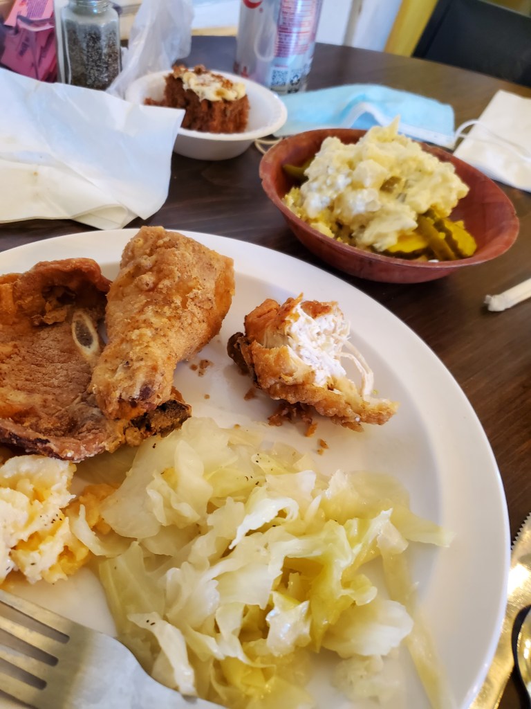 Did I actually label the meal, “The Best Fried Chicken I’ve Ever Had!”? Yes, I did. And, it was the best I’ve ever had. This fried chicken was tender, moist and flavorful. I like their (Seaboard Station Restaurant, Hamlet, NC) steamed cabbage also, which is sweet. I don’t think they use any seasoning meat for this. The carrot cake is delicious, but that is Sara Lee. I can take fixins from their salad bar and make a good potato salad.