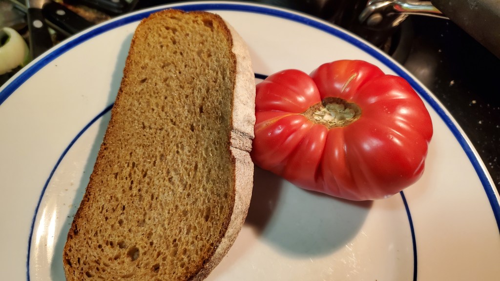 NOTE: Now that I take a look at the remaining heirloom tomato, I’m not sure both of them were the same type. The first had the purple hue, but this one is more reddish. *Yes. When I cut into the second tomato, it was different. It was reddish and not purplish. It had good flavor. Not a great tomato, but a good one.