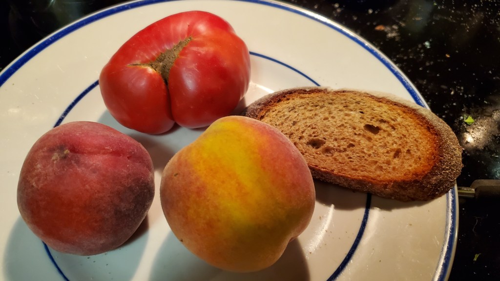 I bought a couple of types of peaches and two heirloom tomatoes (not sure if Cherokee Purple, Purple Boy, etc.). One of those times when I didn’t ask them to write the peach type on the bags.