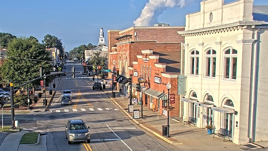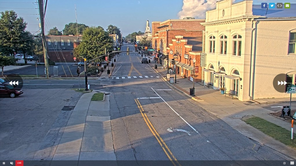 I was looking at the Apex web cam view this morning and noticed a small cloud above the buildings in downtown Apex. I think the cloud had a bluish color at first but soon I noticed that it had turned to a pink hue. It took me a little longer to realize that the cloud wasn’t moving, and then it dawned on me that this was the Shearon Harris Nuclear Plant venting steam from it’s cooling tower. *And, pretty soon after that, the cloud got much bigger.