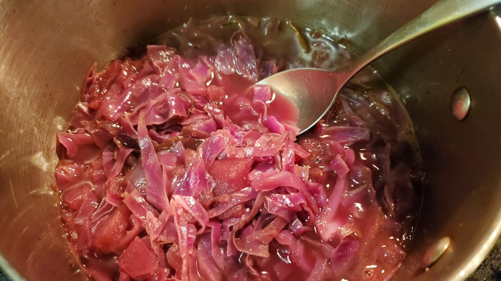 So, I am fixing Traditional German Rotkohl (Sweet/Sour Red Cabbage) right now. I didn’t realize it took a couple of hours to let it cook down. I did not follow the above recipe closely. I chopped up some red cabbage, some onion, a small apple and added it all to a pot with some chicken stock. I put in some margarine, red wine vinegar, Splenda, Agave Nectar, S&P, a little Worcestershire sauce, ground cloves, and bay leaf. I can already tell from the cooking liquid that I’m going to love this.