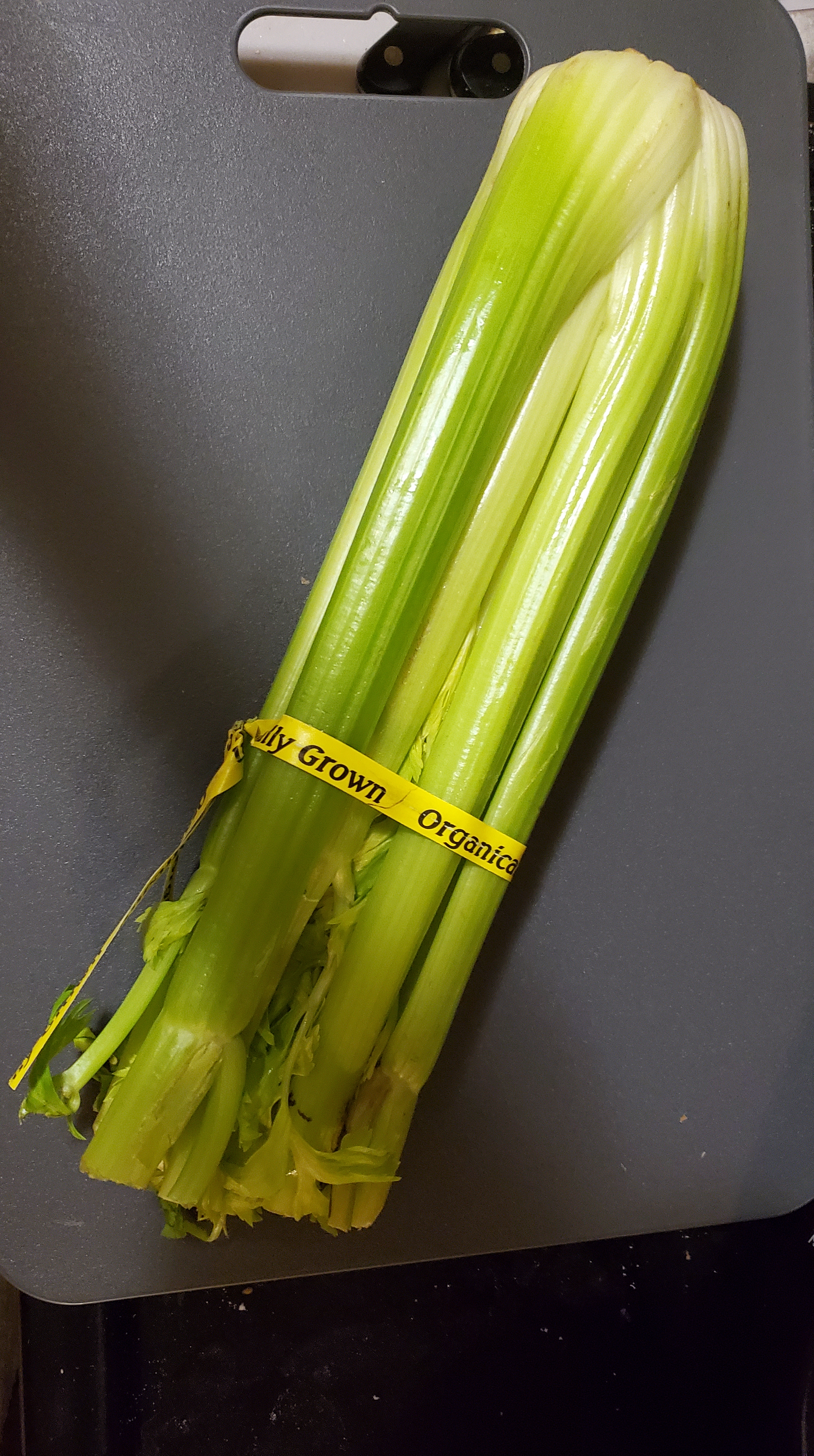 I started with the large Guy Fieri pot on the stove top and added some bacon fat and butter. I then sliced some regular onion thinly, some Poblano Pepper and diced a couple of stalks of celery into the pot. After a short time, I poured in some chicken stock and then Cream of Celery soup.