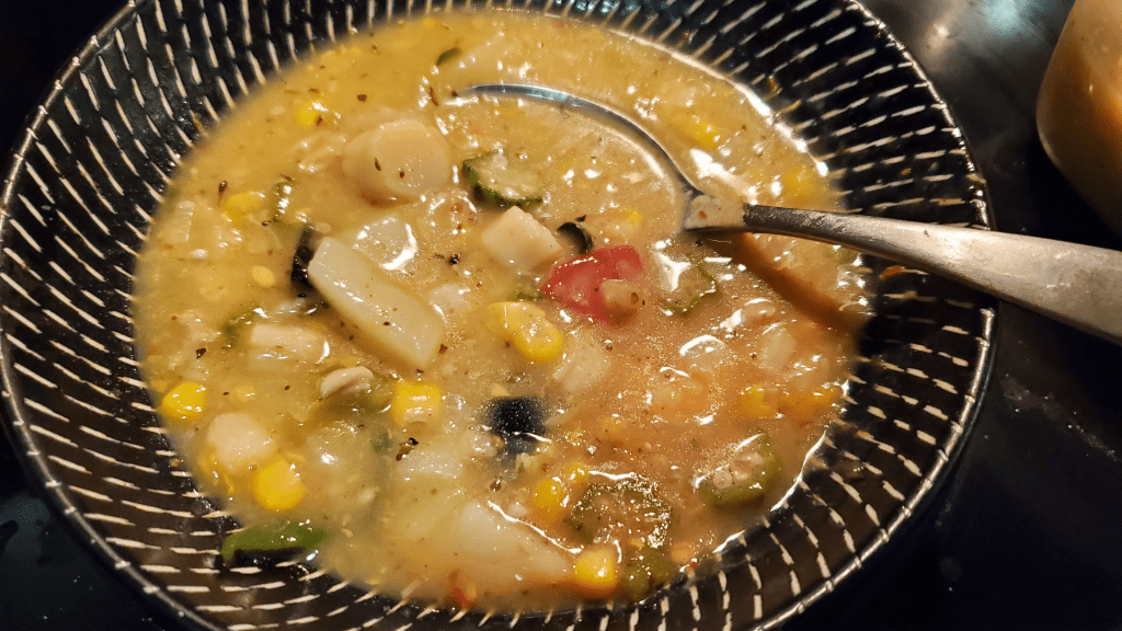 I opened a small can of Cream Corn, and added it to the pot, and then the defrosted Bay Scallops and shrimp and a can of Chopped Clams. I added a small amount of smoked paprika, some gumbo file, marjoram, thyme, garlic powder, cayenne & chipotle pepper, red pepper flakes, cumin & celery seeds and some salt & pepper.