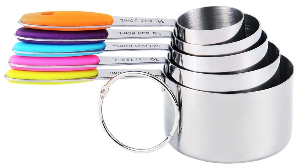 I bought a set of these measuring cups & spoons recently from Amazon.com The spoons stick together magnetically, and the cups have a metal holding ring. I’ve used a cheap, red plastic set of measuring cups & spoons for a while, but I’ve wanted a metal set that you could scrape off the top evenly. *Oh yeah, there is also a leveler with the set of spoons.