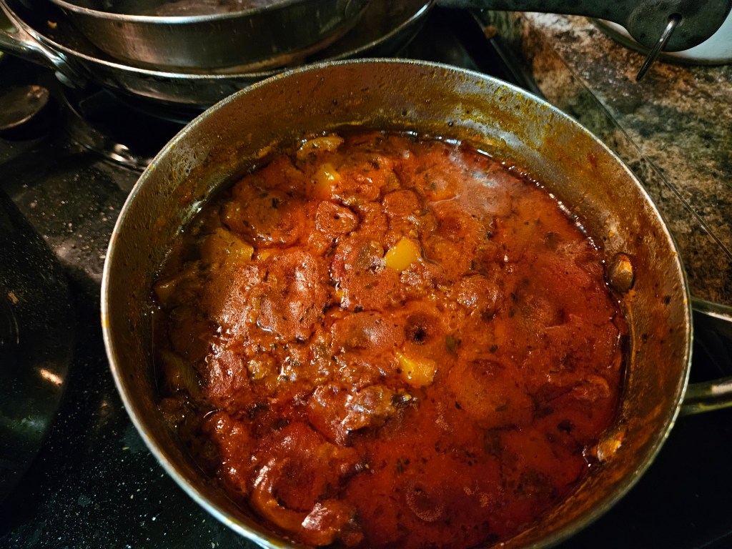 So, I had some lately refrigerated ground beef that I felt the need to cook. I put some of the ground beef in my large pot, with some chopped onion and bacon fat to start vegetable soup, and the rest I put in a smaller 3 Qt. pot with chopped onion to make spaghetti sauce.