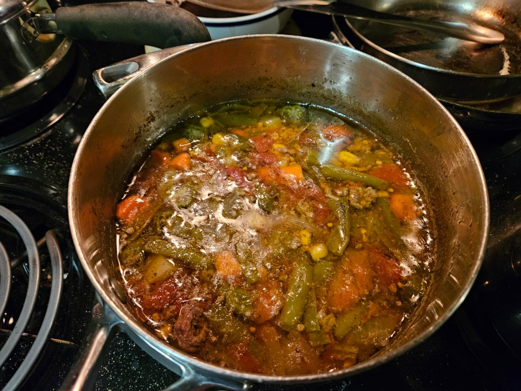 Most of the ingredients that I put in vegetable soup require about “half a can.” I don’t need a whole can of diced, fire roasted tomatoes, or a whole can of green beans, or a whole can of corn. So, I tried the following: The previous batch of soup that I made, I put half a can of several veggies in that soup, and the other half I put in a Tupperware container (all mixed together) and then placed in the freezer. It didn’t make any sense, but I used a black marker and wrote on a sandwich bag the date and that this was Vegetable Soup Starter, and listed the veggies: carrots, corn, green beans, tomatoes, & okra. I put this reminder on top of the veggies, and placed the Tupperware lid on top. Not sure how I could have put the note on the outside of the container, but it did look neat, when I took the lid off. *I did also cut some fresh okra for this soup, and after the soup was almost done, I peeled and diced a potato. I like to add the potato at the end so that they do not get too “mushy.” I probably should also do this with the carrots, but they don’t seem to become as mushy with a longer cooking time. What else: Bay leaf, S&P, sweetener, Agave Nectar, thyme…