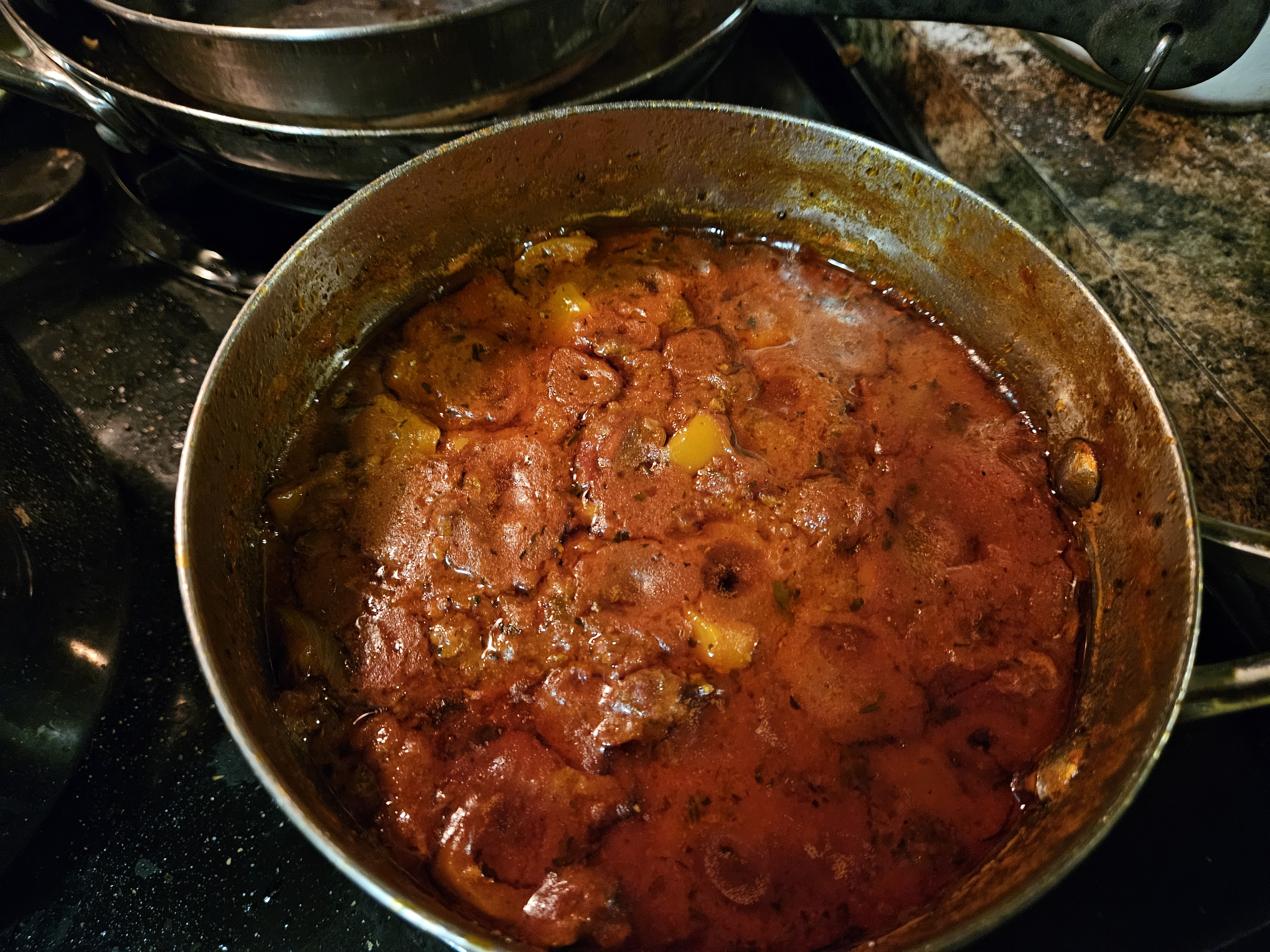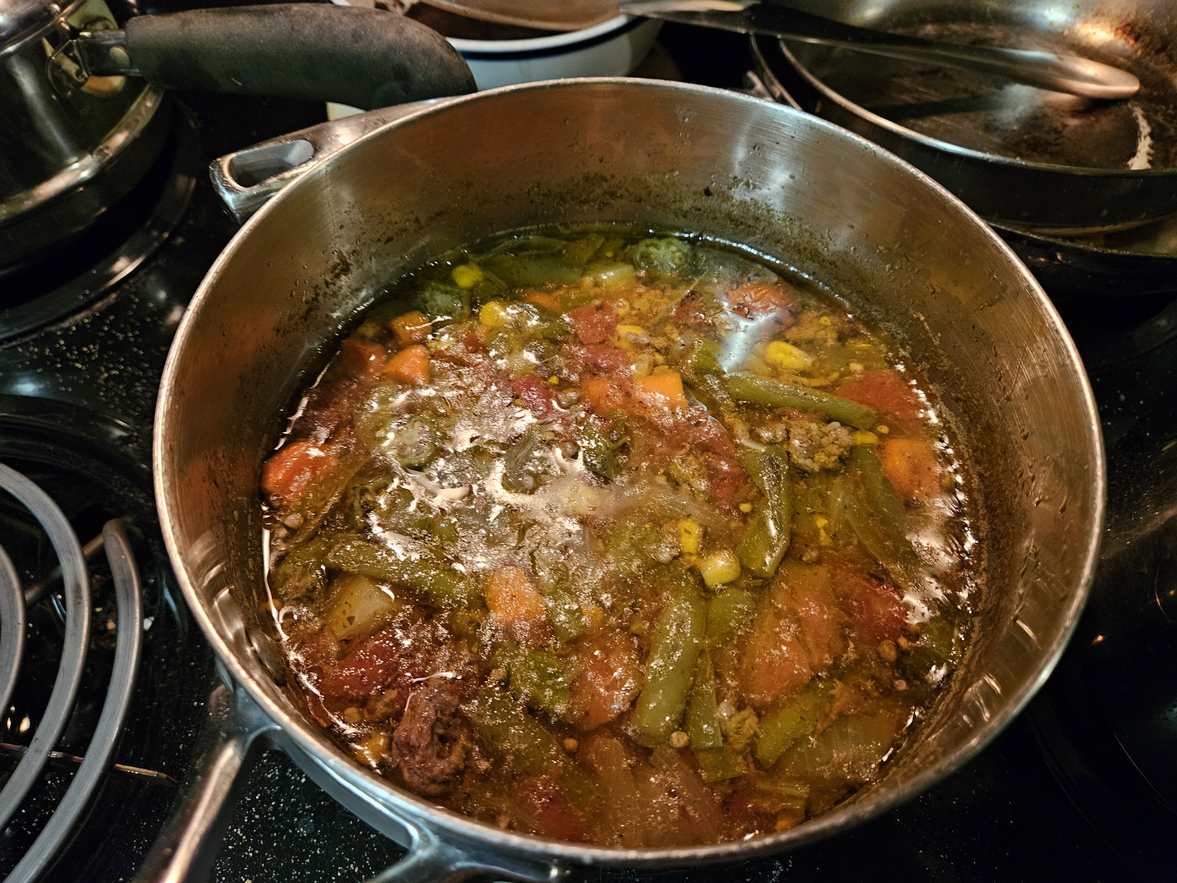 So, I had some lately refrigerated ground beef that I felt the need to cook. I put some of the ground beef in my large pot, with some chopped onion and bacon fat to start vegetable soup, and the rest I put in a smaller 3 Qt. pot with chopped onion to make spaghetti sauce.