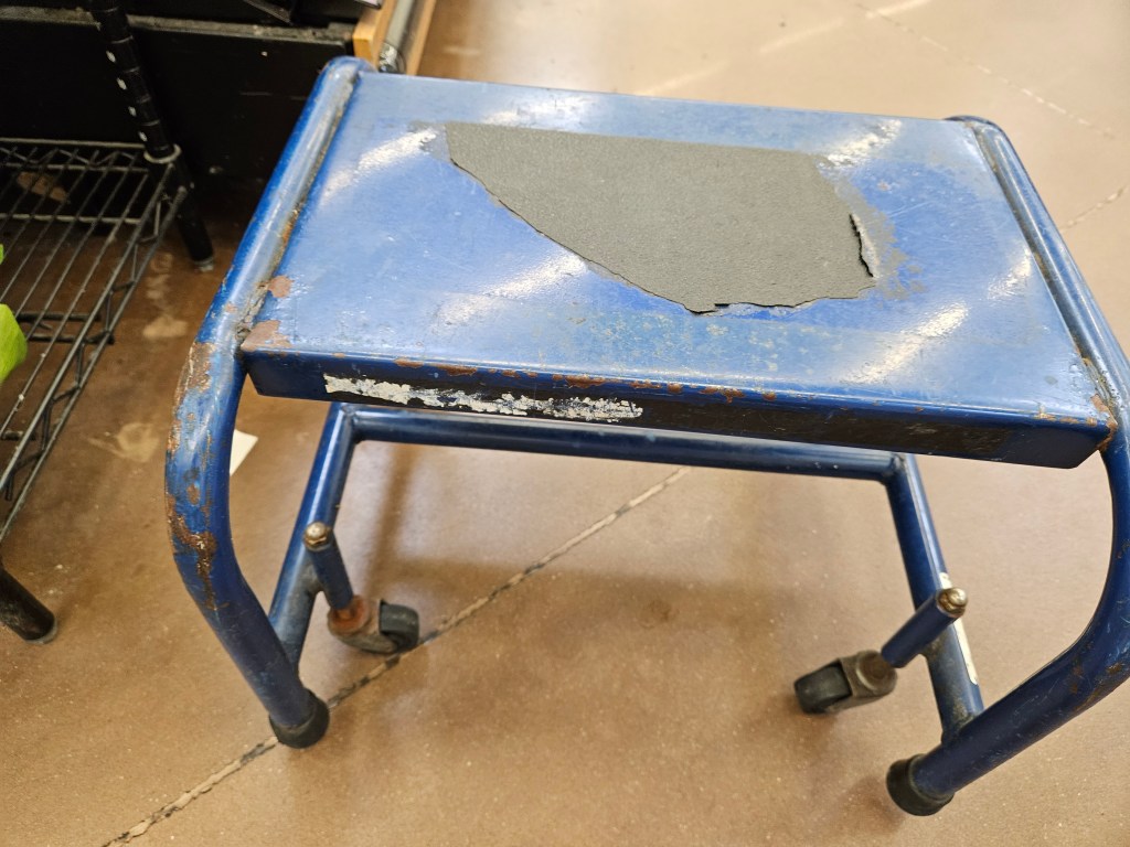 Several days ago I was thinking that I needed a stool so that I could sit on it and clean my floors with a scrub brush or sponge. I had this thought several months ago too, but never found anything that I wanted to order. But, as I was looking through my online images on Amazon Photos recently I saw a picture of a metal stool I had taken a couple of pictures of while in Walmart. It was a well used blue painted metal stool that an employee had left out on the floor and I even turned it on it side to get a better second picture. I think this stool may have been on rollers that when you sat on it, it locked the stool in place.