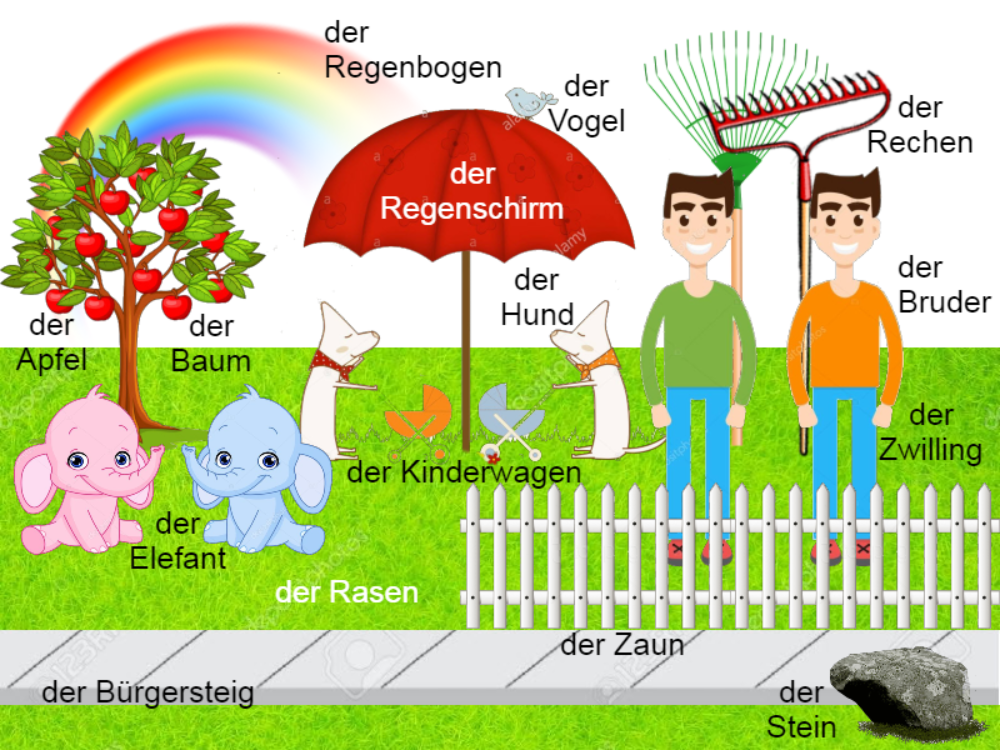 I thought that if I needed to learn the specific definite article for each noun individually, that would be almost impossible for me, so I came up with a learning trick. My trick, and it worked for me, was to create noun cards and create a collage of images representing the different nouns on each card. But that’s not the whole trick. What works is to just put nouns on one card that have the same definite article. Only nouns that have the “der” article go on one page, another card only has nouns that have the “die” definite article and on another card only “das” nouns are shown.