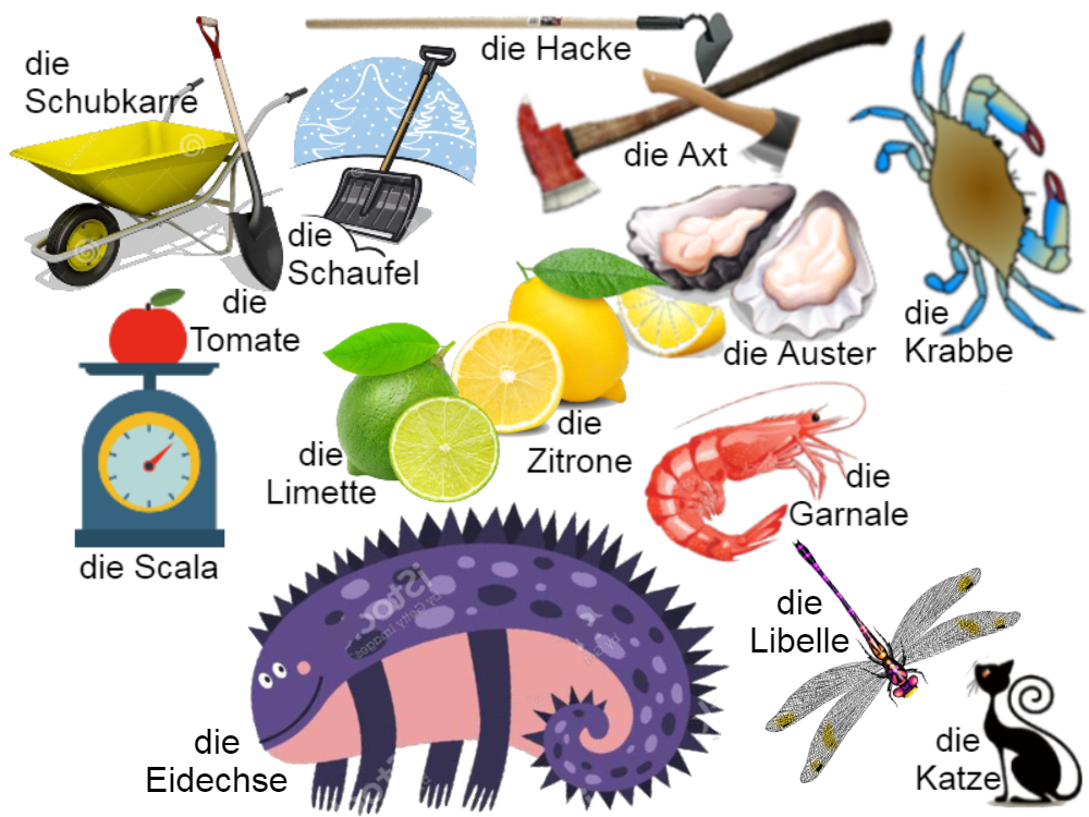 The better the image I used for each noun represented that noun “for me,” the more chance I had of remembering it. And, if I laid those nouns out in a pattern that helped me remember them in a certain order, that was also better. But the idea was that I am a visual learner, and I remember images, and so if “die Katze (the cat) image was on a page, and I remember that “die Auster” (the oyster) image was also on that page, and others such as the picture of a lime (die limette) then when I needed to remember a noun, the other nouns on that page helped me remember which definite article they all used. I remembered that card had a cat, an oyster, a lemon, a lime, a scale, a tomato, a shovel, a wheelbarrow, etc. and if I remembered the German noun for each I then remembered that all of those nouns took the feminine definite article, “die.”