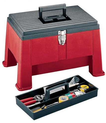 My “Step N Store Toolbox” arrived on Tuesday. Not much to say but that it appears to be “as advertised.” The construction is simple and sturdy and there appears to be adequate space inside to carry necessary household tools or cleaning supplies. There is a plastic insert tray that fits inside and sits at the top, providing a little space on one side for a tall spray bottle. There is plenty of room beneath the tray insert for other storage. The stool is sturdy, and I both sat on it and stood on it. In the kitchen, I used a nearby counter to stable myself as I stepped up on the stool, but I would need my extra “Stepper” exercise step as a pre-step if “I was positioning myself to change a light bulb in the middle of the room.”