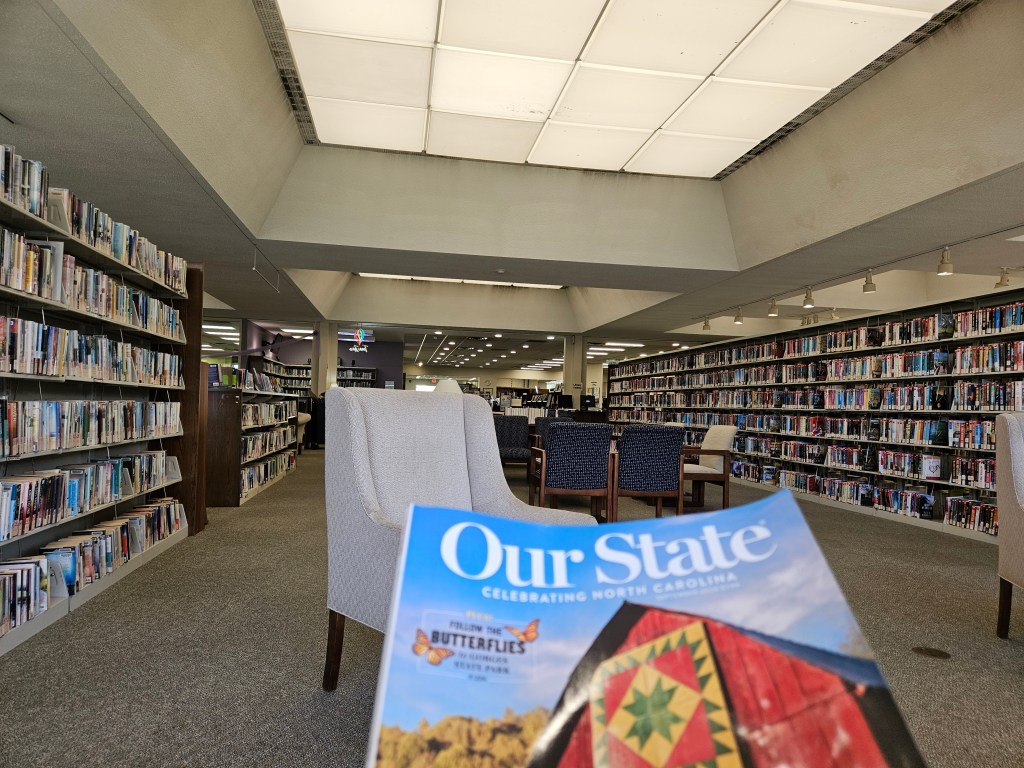 I made my way around the library floor. Eventually I found a small magazine section, a man sitting reading close by. I reached for the latest “Our State” magazine and walked to a nearby chair and started to read. There were a few pages selling items for Christmas, with North Carolina themes. One I liked was a Tree ornament that had several images included that were NC focused, a lighthouse and an outline of North Carolina being two of them. The only two I can recall at the moment. I do recall another item. It was an oyster board that had carved indentations for 12 oysters. This was for sitting and eating fresh oysters in the half shell. Although, I guess you could actually stand and eat them.
