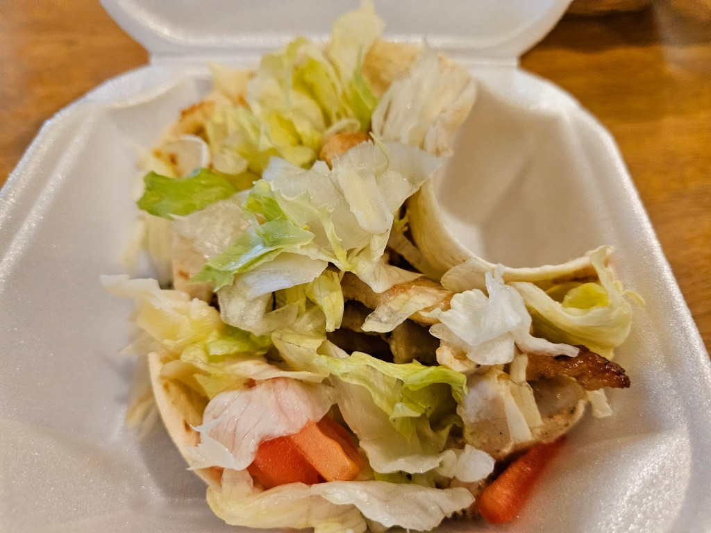 After travelling about Asheboro and visiting the Library, I returned to David’s around 2 pm for lunch. There were just a few cars in the parking lot and few customers inside still eating lunch. I ordered their Taco Special which also came with soup. I asked about the soup and later another waitress came out with a small sample of a tomato based soup (a light broth, with orzo noodles). and a creamy spinach soup. I liked the flavor of both soups, but asked for the spinach, and also because the meal came with two tacos, I asked if I could have one taco with beef and the other taco with chicken. The waitress thought a moment and then said, “I don’t see why not.” And sure enough, when she brought my tacos, I had one of each. The chicken was hidden by a copious amount of shredded ice berg lettuce and shredded cheese.