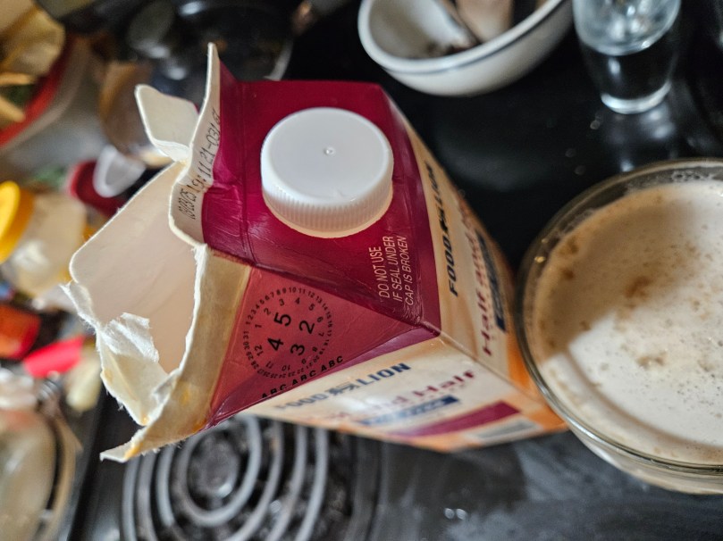 I have started transferring my Half-n-Half creamer to a glass bottle because I like the feel of the cold glass when I am pouring the creamer into my coffee or tea. I am reusing an Egg Nog bottle, that is shaped like the old glass milk bottles that the milkman, in the past, delivered milk to your home. But this bottle is slightly smaller, but still the same shape.