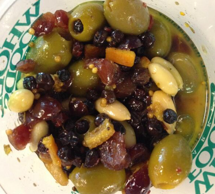 The dried cranberries have plumped up, and the green olives have taken on the flavor of the marinade. *An earlier attempt, I didn’t let the olives I was using marinate long enough and they still had the distinct olive flavor. But given enough time, they will become pickled.