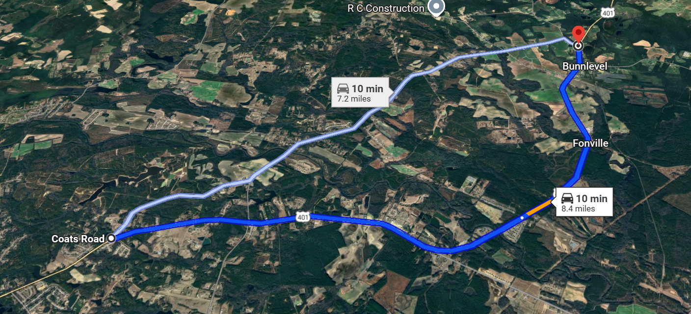 Still not sure which route is fastest between Fayetteville and Lillington. As you can see above, there is an alternate route that is 1.2 miles shorter, but takes about the same time to drive. It’s that alternate route that I’ve been driving since they made the roundabout on 401. There are two Stop signs on the alternate route, but other than that, it is a straighter route than 401 and you bypass slowing down through Bunnlevel.