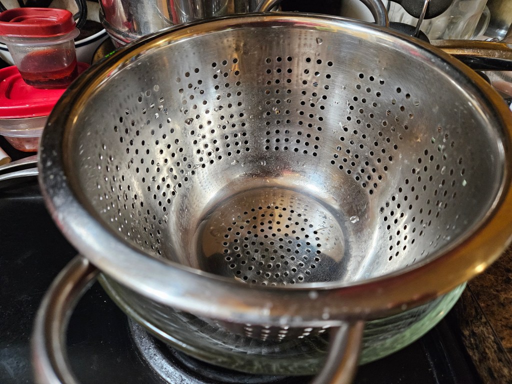 I already had all the necessary equipment for the process: a Guy Fieri stock pot, a Frugal Gourmet soup ladle, a shiny new collander, a glass mixing bowl, and a spoon.