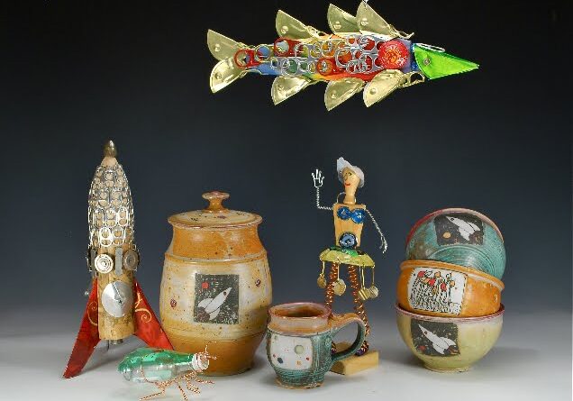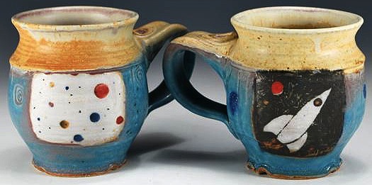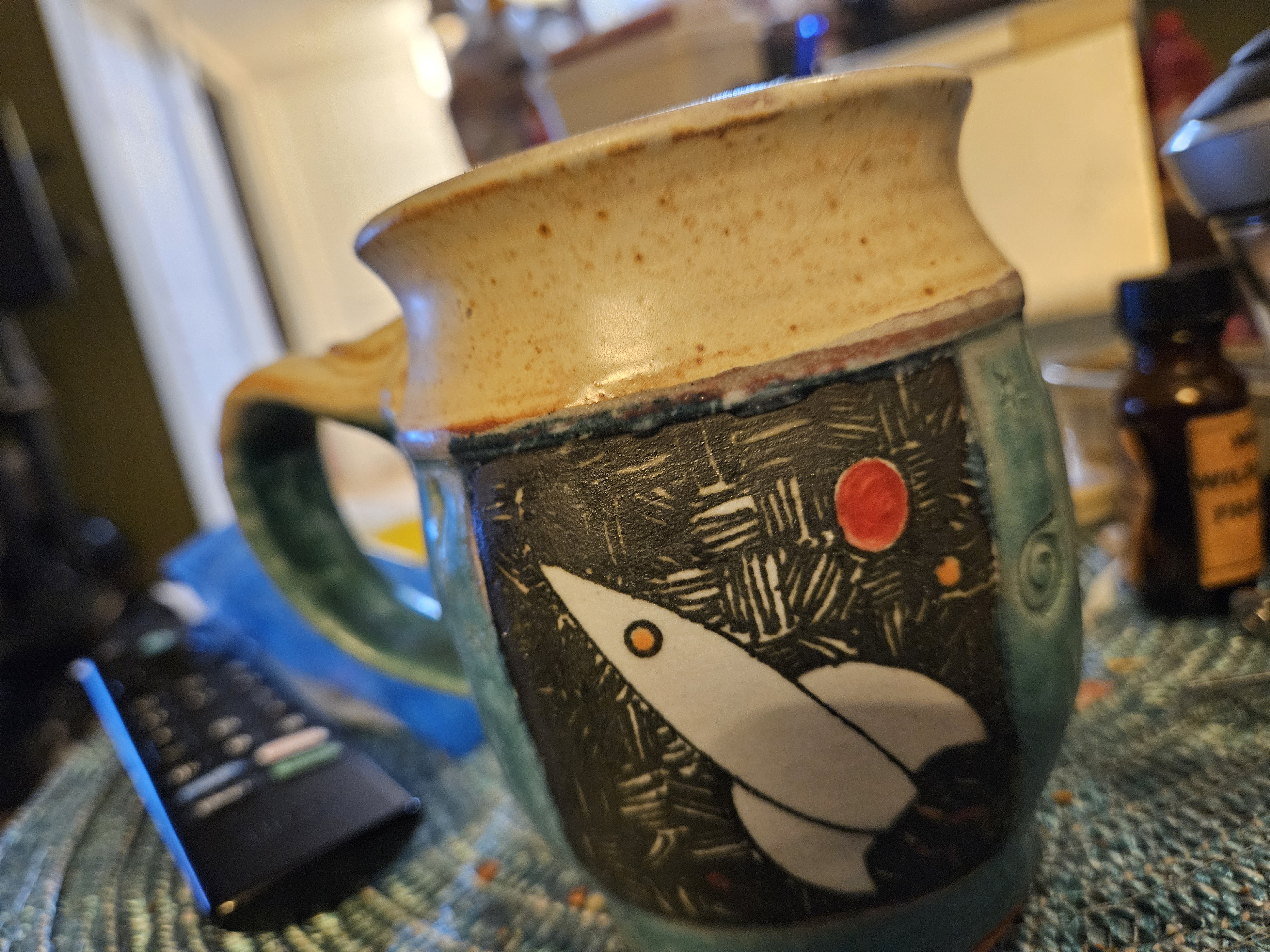 I bought the mug because of the various whimsical elements: cartoon space ship, plants which in my mind represent an alien race or community, the swirls embedded into the mug, and the “three point” nature of the mug’s odd shape. *I did not expect to find the following YouTube video in which Claudia Dunaway explains how she makes the imprinted pottery/mugs. She is actually using the image that I have on my mug of a cartoon spaceship. And, if you look closely at the video, there are several not yet printed mugs that might be like mine once finished.