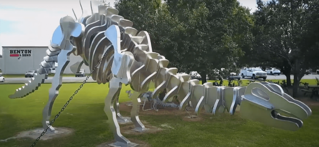 In my brief reading on their web site, I see that the owner gave his employees projects to create these metal dinosaur structures during the economic downturn in 2008/9. They continued to hone their fabrication skills and were getting paid to work.