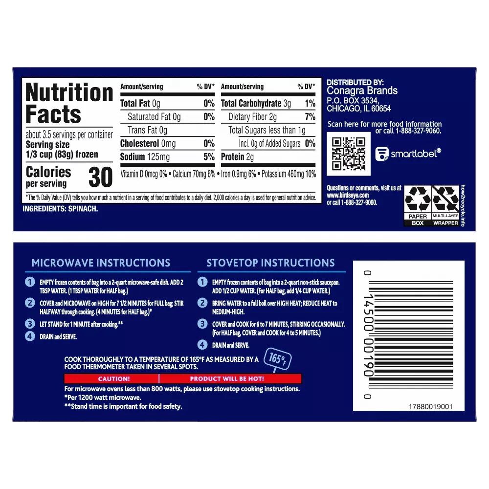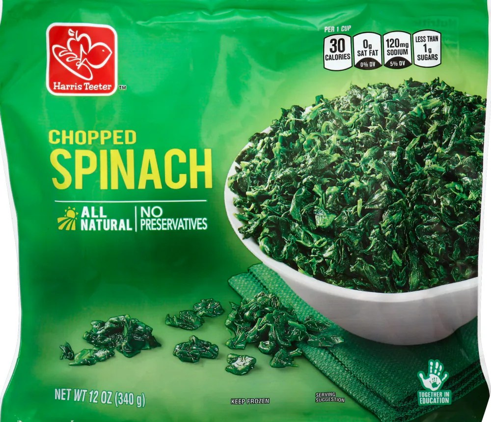 It looks like the Walmart Great Value Brand of Frozen Chopped Spinach has the least amount of Sodium and is the cheapest of the three brands listed above. The calorie count per serving is slightly above the other two. The Bird Eye Brand at Target is the most expensive, because it is more expensive and the number of ounces is only 10, instead of 12.