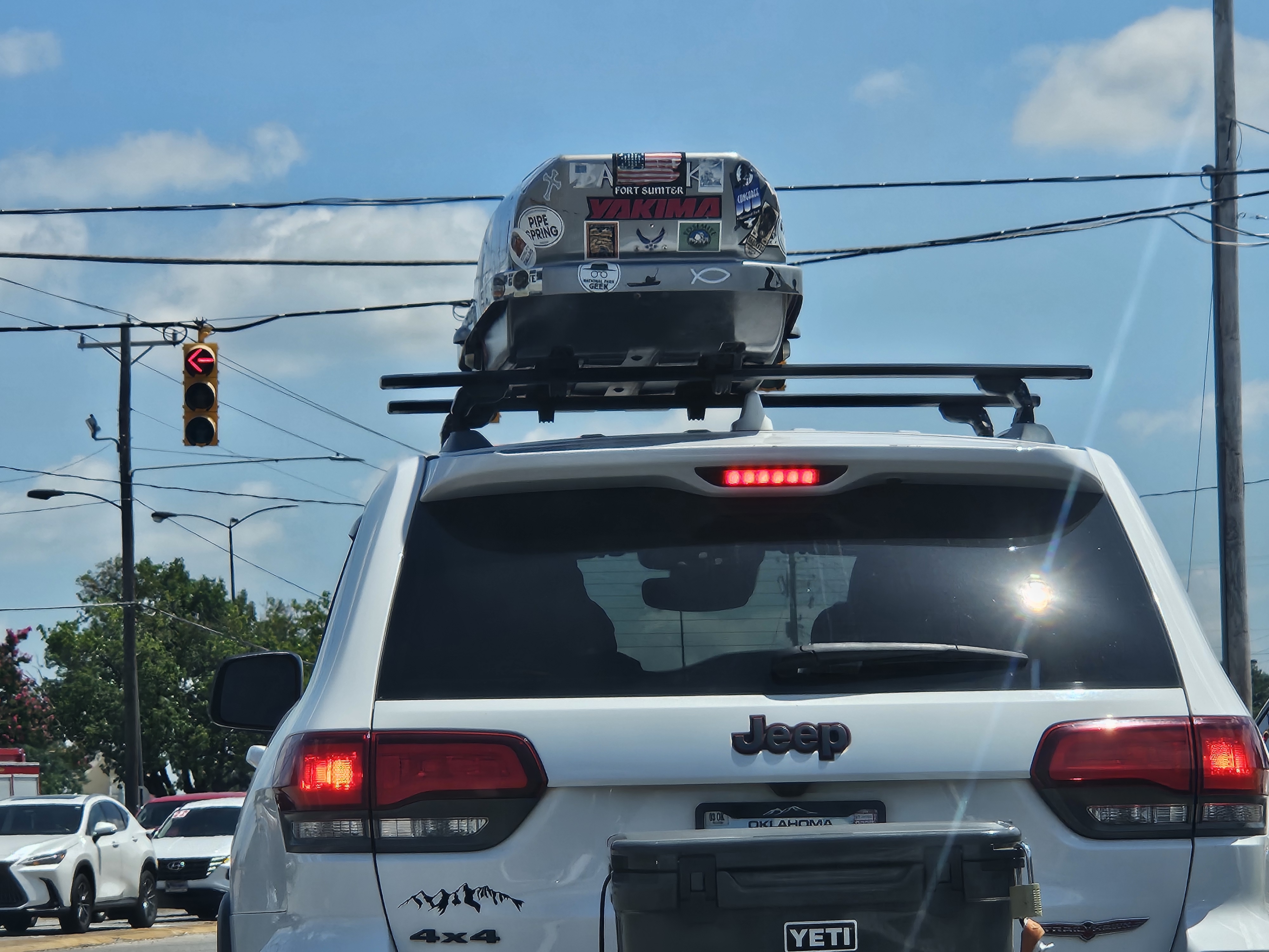 On the way to lunch, a car passed in front of me and I noticed the carrier on the top. But, it was just the shape of the storage container that intrigued me. I thought that would be a great shape for an e-foil. You could sit on it and straddle it with your feet resting on some kind of stirrups on each side. I know this would add too much weight for the e-foil to easily lift off of the water. I saw the carrier from the side, and then was never able to get up beside the car to take an image of it length-wise. It had an organic shape. When I zoomed in on the carrier I saw the company name as YAKIMA.