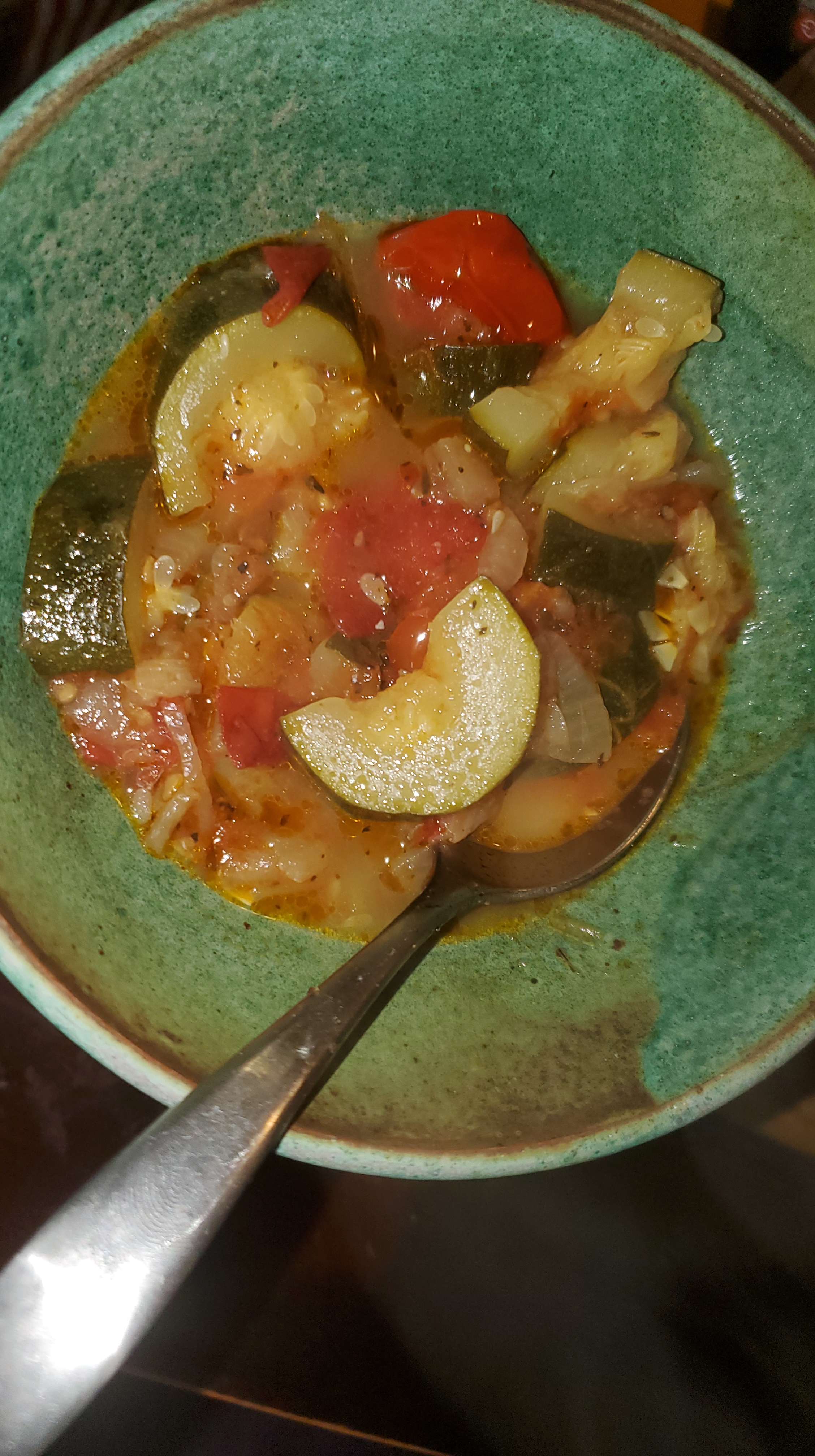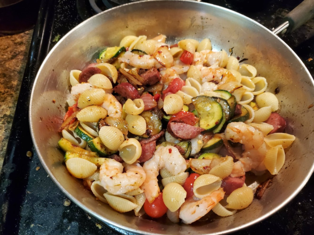 My Zucchini, Shrimp & Kielbasa dish needs just a few small red tomatoes to give it just the right flavor. Not enough to make it a tomato dish, but enough to make a pinkish broth.
