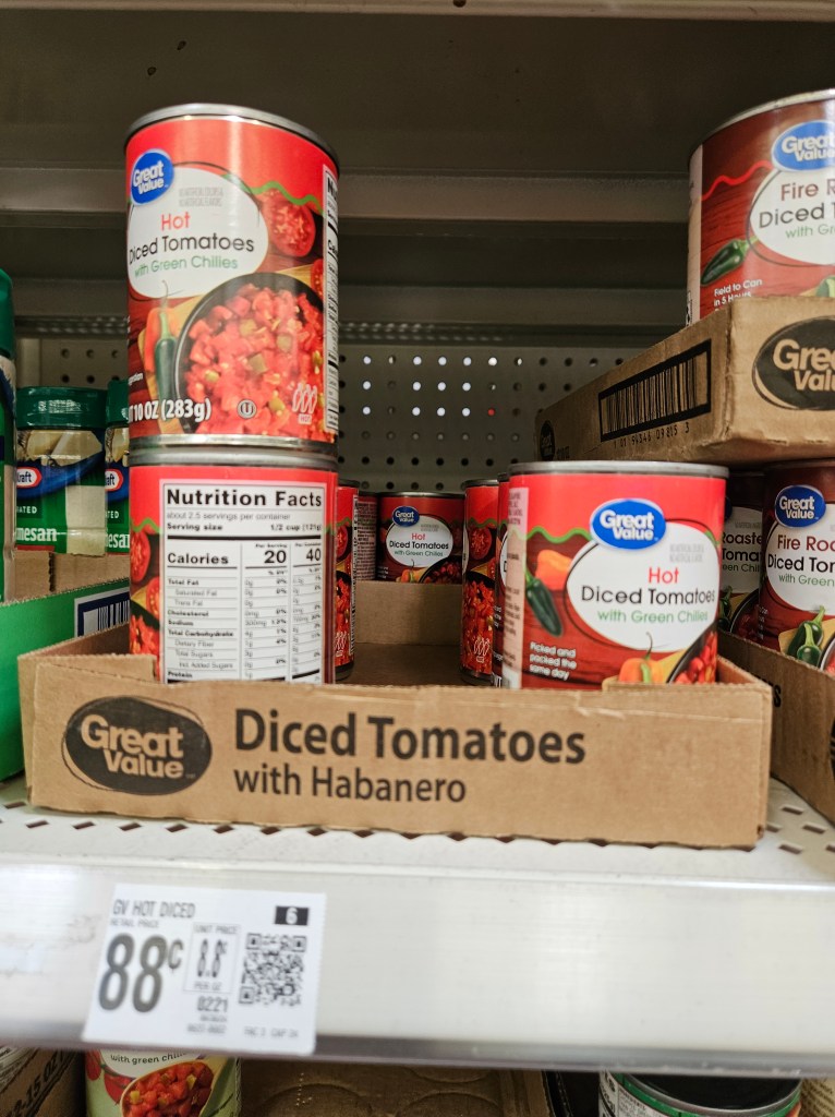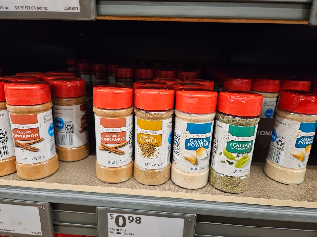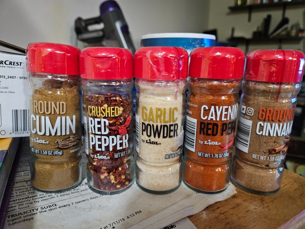 I was shopping in Aldi’s yesterday and took a closer look at their spice rack. The apartments where I live are having a three weeks Food Drive (July 14th – August 8th). I’ve got a lot of canned goods that I plan to donate (my knee jerk reaction to the Donald Trump Tariffs) so I was thinking about this in Aldi’s.