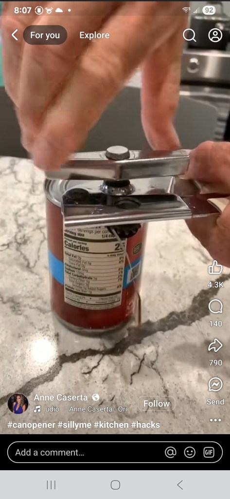 NOTE (08/03/25): I was looking at some YouTube videos again this morning about eating the right foods for controlling blood sugar, and I came across this video by accident, but… I have this style can opener and have used it for years, but every so often, this opener fails to open a can. But the reason is either the metal of the can is too soft and it doesn’t allow the opener to penetrate the can top… or the can top is recessed too deeply and the opener can’t penetrate the lid. This is why I pull out my John Wayne and finish the job. But having seen the alternate means of using this can opener, I may never use my John Wayne again, unless I don’t have my usual opener.