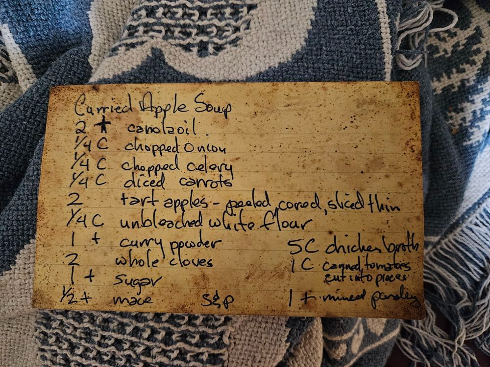 The purpose of this page is at least two fold. First I am recording the recipe for one of my favorite soups. Curried Apple Soup. And a second purpose is to show how an AI can help you convert a recipe, from either an old cookbook or even a handwritten recipe card into a digitized text version of that recipe, easily and quickly, without you having to manually retype the whole thing.