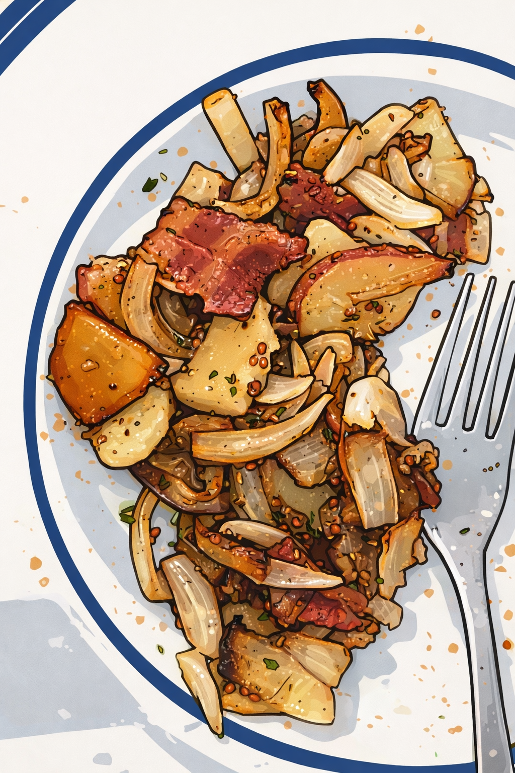 NOTE [04/08/26]:ย Iโve made this twice in about 3 days, and it is easy to prepare and quick to cook and delicious. I only used 1 small red potato this time, and about half of a large sweet onion sliced up. One trick that I use is slice the potatoes up and put them in my Microwave Onion Cooker and nuke them for about 2 minutes, with a little water in the bottom of the cooker to steam them and soften them. I cook my bacon for 3 minutes total. 2 minutes first and then 1 more minute. I break up the bacon in the pan. I sautee the onion in the skillet with some olive oil. After the potatoes are soften I add them to the skillet with the onions and mix. Then I add some red wine vinegar, some Splenda, and/or Agave Nectar, and then some S&P and celery seeds and brown whole seed mustard. You may have to add a little more liquid if it gets too dry on the skillet.ย [end NOTE]