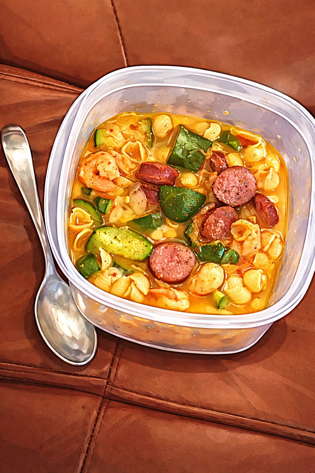 I first made this dish several years ago โ at about three in the morning โ just experimenting with what I had on hand. I wanted a pasta that wasnโt heavy and tomato-saucy, but still felt complete and satisfying. What I ended up with surprised me: every bite had a different character โ a piece of shrimp, a bit of smoky kielbasa, a juicy zucchini slice โ and the onion and tomato melted into the background, supporting everything without overpowering it. Iโve made it many times since then, always happy with how balanced and colorful it is.