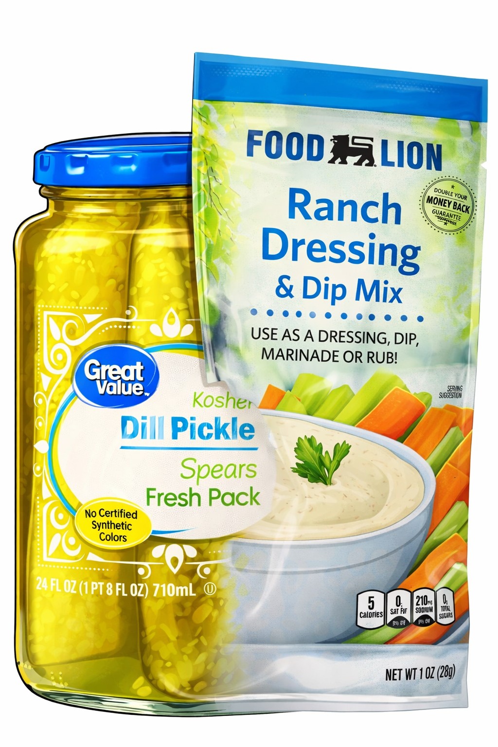 There is not much to making Ranch Dill Pickles. Buy a descent dill pickle, which is the Walmart GV Dill Pickle Spears. They only cost about $2.65. I may not be a connoisseur of Ranch Dressing, but I have been perfectly happy with the cheap packets from Food Lion (about $.50) or Walmart GV Ranch Dressing (for about $.65). Open the dill pickle jar and depending upon how full the jar is with brine, pour some out in a container. Then add the whole packet of dressing mix to the brine in the container. If you need to add back some brine so that all the dill spears are completely covered, do so. Put the lid on tight and give it a good shake to mix the dry dressing into the brine. Put the mix into your fridge and wait a day before trying your new batch of Ranch Dill Pickles.
