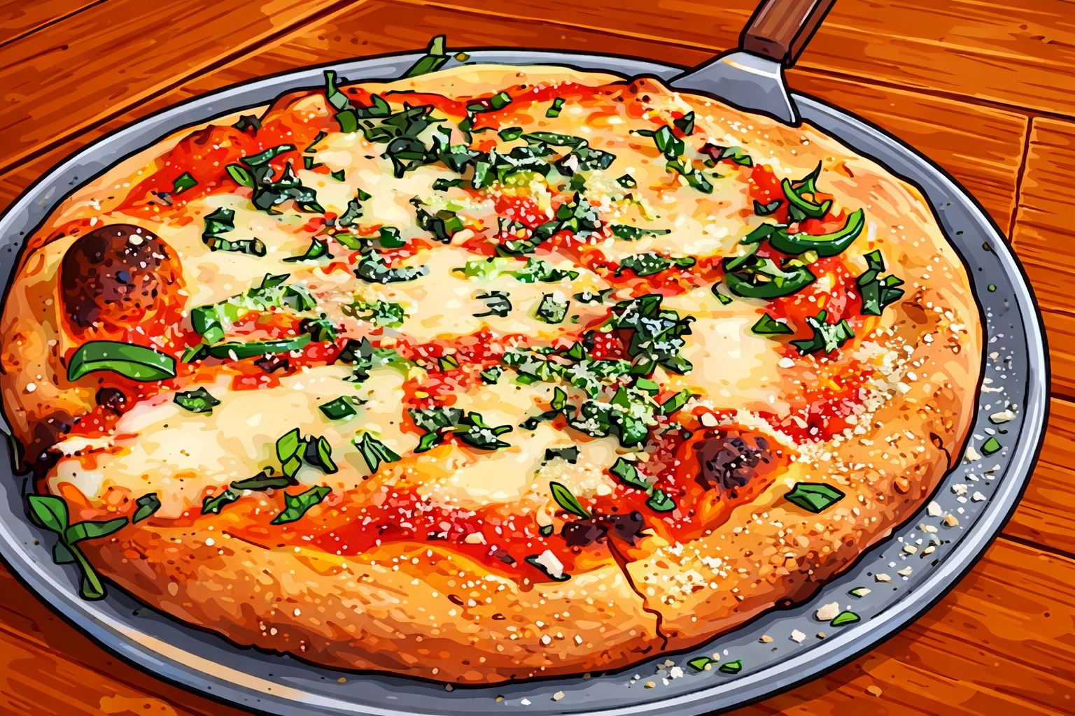I have them add fresh jalapenos to this basic Basil & Mozzarella pizza, and I pour on the Red Pepper Flakes and the ground Parmesean Cheese at the table.