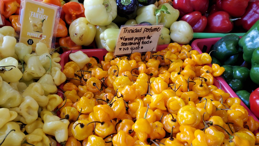 Later in the summer, there is a vendor at the State Farmers’ Market in Raleigh that offers a great number of varied peppers, both mild and hot. I do not like the very hot peppers. I do like the peppers that have distinctive flavor. A jalapeno or poblano, both roasted, have just enough heat. I have mentioned elsewhere three other distinctive peppers but I can’t always get them. Actually, I tried all three a couple years ago, and was only able to get one of the three last year. I asked all season long, and they were never available for sale. Biquhino, Trinidad Perfume and Brazillian Starfish. I found another pepper, Ajicitos Dulces Peppers, at Compare, and have frozen some of them. I can take one out, cut it, and add it to whatever I’m cooking. I’m not sure it is that distinctive in flavor, and it doesn’t have any heat.
